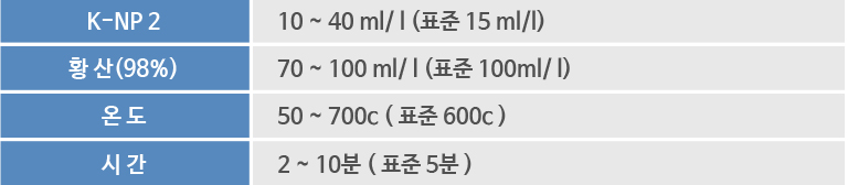또한 50~60℃ 의 낮은 온도에서 2~10 분 침적 하여 성형물 표면의 변형을 동시에 제거하여 주는 Annealing 효과를 얻을 수 있고, Etching 효과 향상 및 밀착력 개선의 역할을 하게 된다.